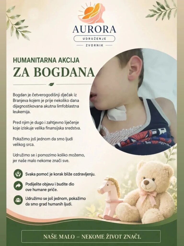 Udruženje „Aurora” Zvornik pokrenulo je hitnu akciju prikupljanja pomoći za četverogodišnjeg Bogdana iz Branjeva. Malom heroju je prije nekoliko dana dijagnostikovana akutna limfoblastna leukemija, a pred njim je dug i zahtjevan put ka ozdravljenju koji iziskuje značajna finansijska sredstva.
