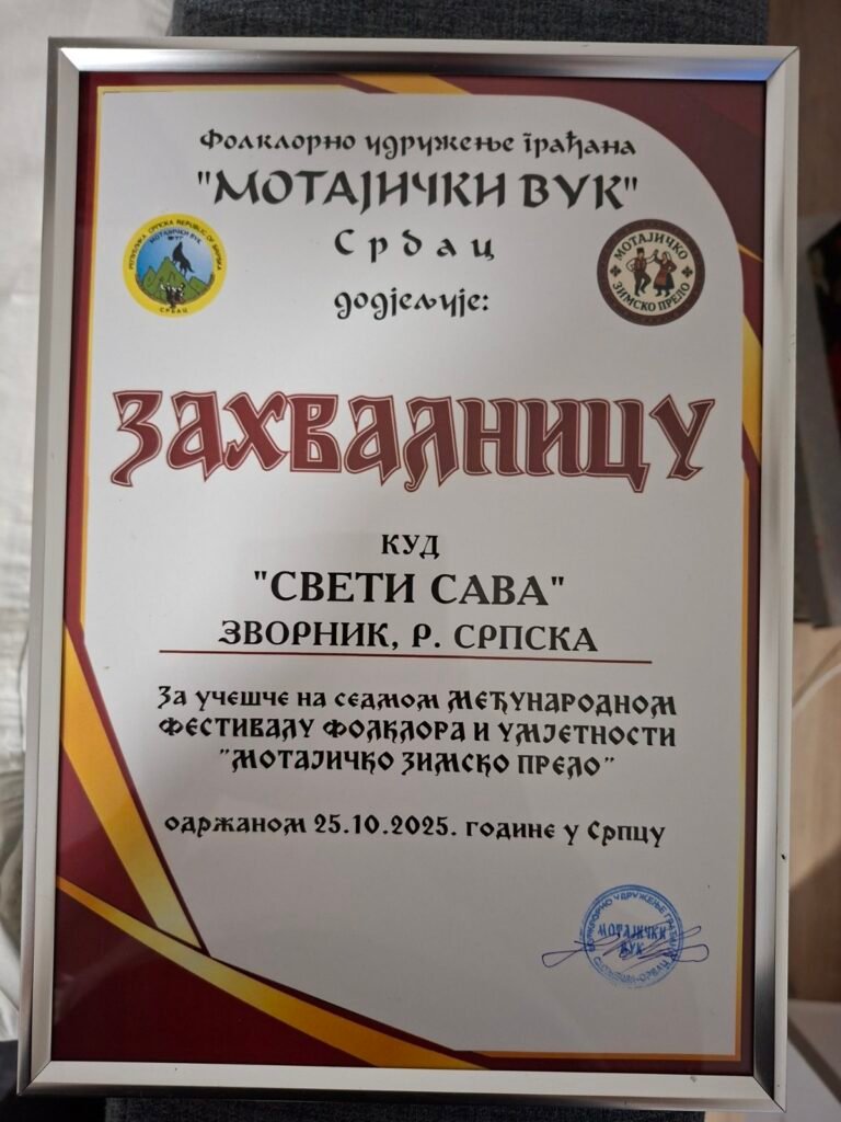Kulturno umjetničko društvo ”Sveti Sava” iz Zvornika u subotu je učestvovalo na sedmom Međunarodnom festivalu foklora i umjetnosti ”Motajičko zimsko prelo” u Srpcu.
