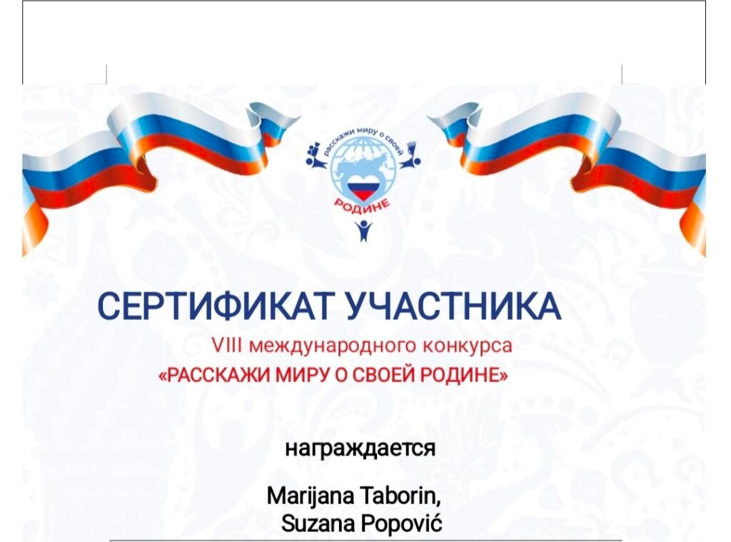 Mališani iz starije vrtiće grupe „Štrumfovi“ (objekat „Naša radost 2“) ostvarili su zapažen uspjeh na VIII međunarodnom konkursu „Kaži svijetu o svojoj domovini“. Za svoj kreativni doprinos, vrtić je nagrađen sertifikatima i posebnim zahvalnim pismom organizatora.