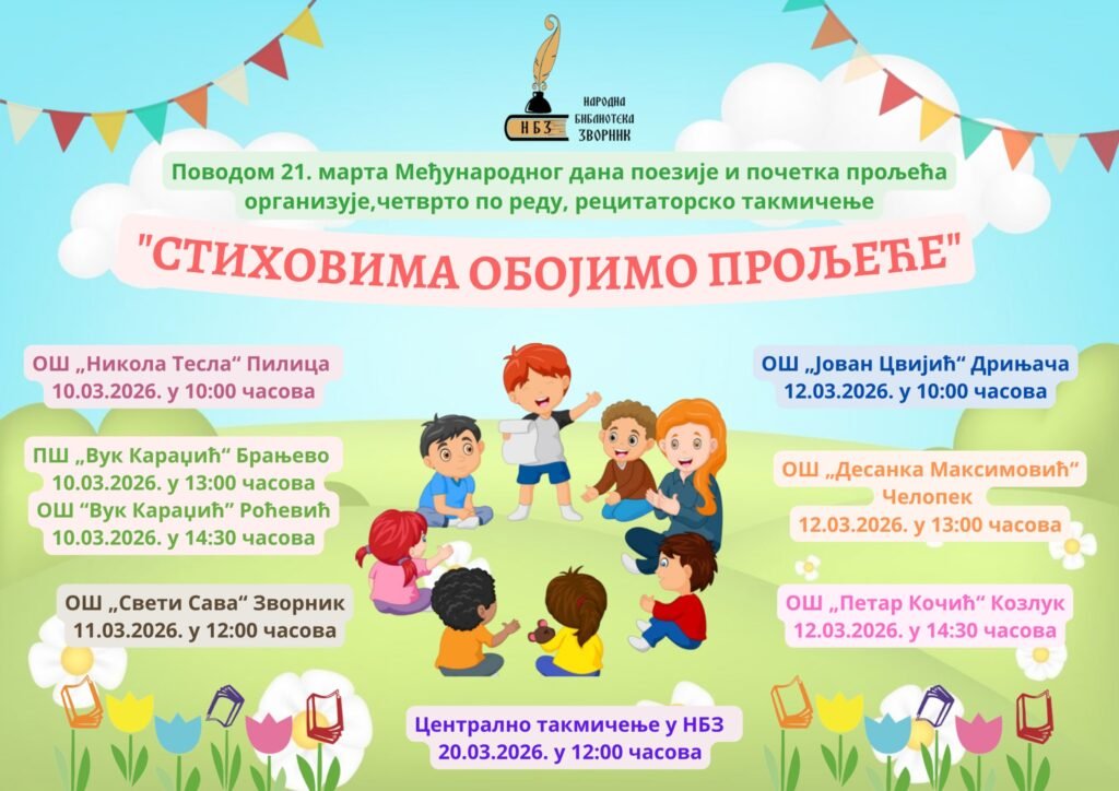 ZVORNIK – Povodom 21. marta, Međunarodnog dana poezije i početka proljeća, Narodna biblioteka Zvornik (NBZ) i ove godine organizuje tradicionalno, četvrto po redu, recitatorsko takmičenje pod nazivom „Stihovima obojimo proljeće“.